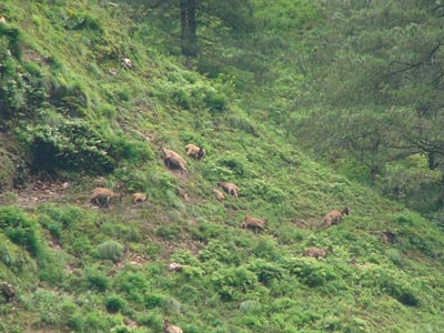 One of the biggest crimes in this region, where killing of animals has traditionally been avoided, is hunting wildlife. The laws laid down by the Nubri’s ancestors decree a public flogging for anyone who kills a wild animal. The offender is stripped, and 500 lashes are administered on his buttocks. In the evening a herd of jharals (Himalayan Tahr) appeared on the slopes of the hill to the village’s south. They were licking salt from the hill’s walls. For the wild animals of the region the salt must taste better because of man’s withdrawal from the food-chain.
