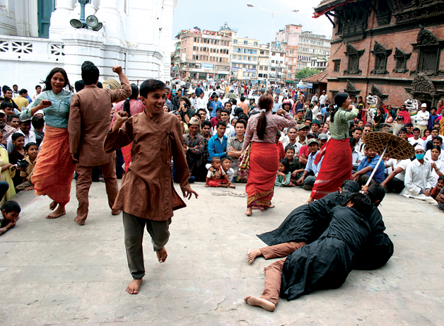 The historian Satya Mohan Joshi says that the theatrical traditions in Nepal started with dabali, a raised platform with performing area inside four portable sliding pillars that could be carried around from place to place. In some cases, ropes were used for delineation in place of pillars. “The dabali, in Nepal, was used as a mode for delivering orders and directives by the rulers to their subjects, forging a channel of communication and educating the masses,” says Joshi. “Use of theater in those forms, as historical evidences show, dates as long back as 5th century AD, when the kings of Lichhvi dynasty ruled the country.”