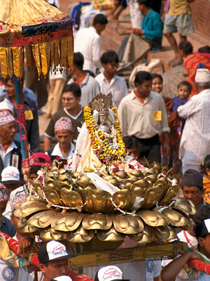 Around noon, at Swayambu, Boudha, and other stupas in Nepal, a statue of the Buddha is placed on a palanquin laden with flowers, katas (blessing scarves), and lights. The Buddha is joined by an enormous procession of monks and lay people chanting prayers, beating drums, and bearing Buddhist flags and paintings of the Buddha. The procession weaves through the city streets, and Buddhist families line the way waiting to give offerings of flowers, incense, fruit, and money to the Buddha as he passes.