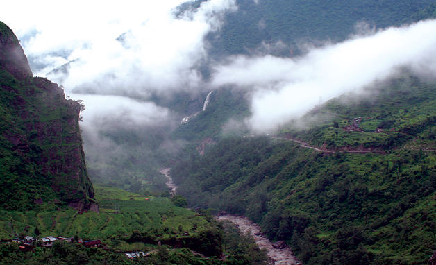 My own journey started in Kathmandu, accompanied by my childhood friend, Parash, a doctor. Being quite obstinate about using only local transports, we took a bus to Pokhara and on the next day to Beni. From Beni we boarded a small bus that took us to Jomsom. The road to Jomsom had only recently been carved out of the hills and was very rudimentary and, at times, extremely scary if not downright dangerous. Enroute to Jomsom, we passed through Galeshwor, Ghasa, Marpha, and Tukche. Several times the bus came so close to the edge of the road that a precipitous drop into the Kali Gandaki seemed imminent. The drop-offs into the river beneath us were frighteningly steep at times. Having found a comfortable perch on the roof of the bus, however, I had little time to worry about calamities. Though dangerous, the ride was incredibly scenic. With the recent rains, the hills were happily clad in shades of green and majestic waterfalls adorned several rocky crevices. Huge eagles soared the skies as I wondered how the land might look from their eyes.