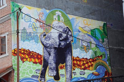 Everyone is talking about the Rainbow City, a mural art project at Krishna Galli, near Patan Dokha. A glance at this huge mural approximately 20 feet by 25 feet in dimension depicts a larger than life size elephant in the centre, in a posterised style with various tones of grey standing on waves of water brilliantly coloured in shades of blue and outlined in black. Together with it in the background is the colourful landscape of Kathmandu, its typical architecture, inspirations from traditional paubha art and many more elements close to Nepali culture in the setting of Patan Dokha. These are illustrated by a map. Its vicinity to the nearby bus stop is integrated through dialogue boxes of conversations at the bus stop.