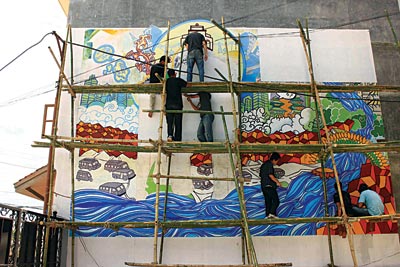 Kiran Rai, Prakash Ranjit, Rabin Maharjan, Saran Tandukar and Subhadra Maharjan were some of the participants. They shared that this was a collaborative work with everyone’s input, and since there were participants from other places besides Kathmandu, the complete work was therefore a beautiful collective of ideas. Yajju Mananhdar shared that the earlier works of City of Philadelphia’s mural projects compelled him to join and he learnt much about enlarging small drawings for murals. Suresh Maharjan, Rabindra K Shrestha and Rajen Rai shared that mural art is a form of art from the prehistoric age and has evolved ever since. “In Nepal however, we called only wall painting mural art, which is a much neglected form of art. The colors we have used in this project are also special which have 10 years warranty and then the top coat adds a protective layer.” Colour management was also done in a very easy fashion; every colour was coded and the codes were specified on the drawings to avoid any confusion and make the working process easier. Rabindra went on to share that he had a wonderful experience and learned this new style of painting on sheets and then pasting it on the wall. He however was saddened by the lack of material to speed up the process of any work. The participants shared that they learned that art has a universal language and can be made into a community project. Even the pattis that are so popular in Nepali culture can be painted with murals thus preserving the moment and the stories painted and unfolding various causes and the ctiy’s walls would definitely look better with such paintings than political slogans.