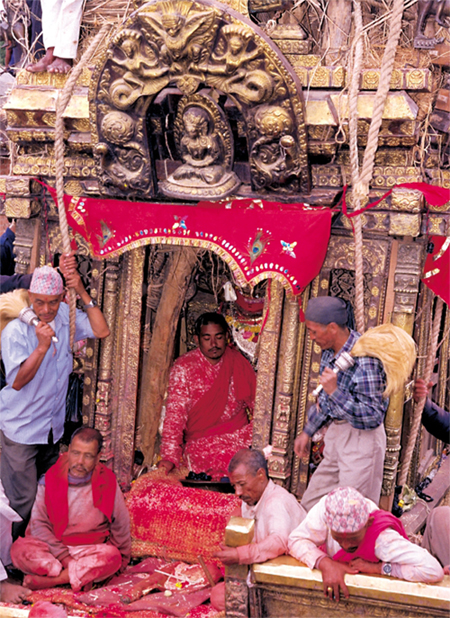 For six months of the year, generally during summer, Bungamati is the dwelling place of this simply carved sandalwood idol. Clearly powerful, this very ancient four-foot, red-faced, many-named, androgynous, wide-eyed god/goddess of agricultural prosperity emanates an almost terrifying sense of atavistic strength. This year is special; the idol in its fantastic chariot will proceed to Jawalakhel and return to Bungamati without wintering in Patan. And most importantly, the Bhote Jatra, the god’s magical jeweled vest, linked to snakes and rainfall, witnessed by the Patan Kuamari (the traditional living goddess), will be held aloft in the chariot by a priest while the crowd roars its approval and swarms the god’s vehicle demanding prasad (consecrated food offerings), while, as witnesses recall, the skies actually do open up.