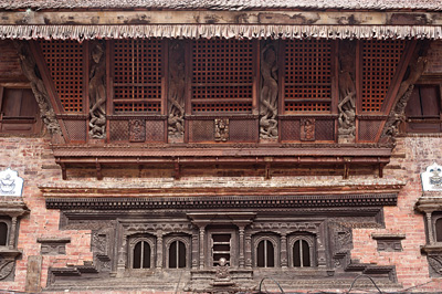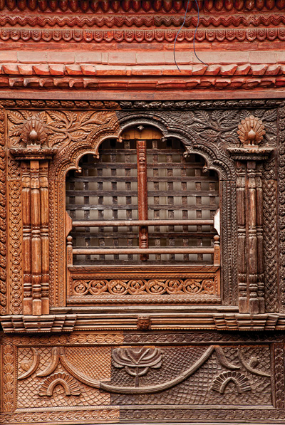 “It took 30 woodcarvers to make this out of three and a half cubic feet of wood,” Ranjitkar says, laying his hand on a thick window frame made of pure sal wood. “There are no nails; it fits together like a puzzle.” The men show us by dismantling the window piece by piece. One of the artisans explains that, when the window is completely finished, it will be jammed into a wall and firmly set in place, just as similar windows have been crafted and jammed into place for centuries.