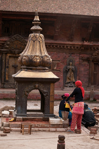 Before leaving, Ranjitkar leads me back inside to the last inner courtyard he is currently working on, Sundari Chowk. The space is smaller than Mul Chowk, but the bath in its center, Tusha Hiti, is the most complex and impressive feature I have seen thus far. 52 intricately carved figures of gods and goddesses line the pool, which was built in 1647. The entrance is guarded by two lions and its perimeter is encircled by two snakes. While the rest of the courtyard is made of brick and wood, the pool is completely comprised of stone.