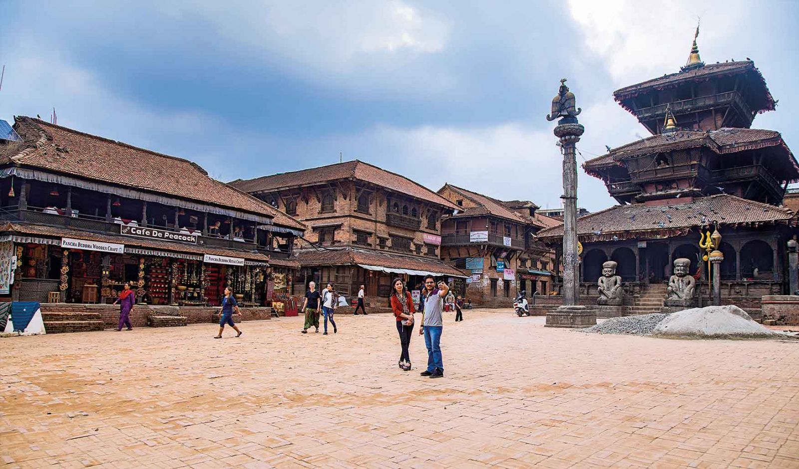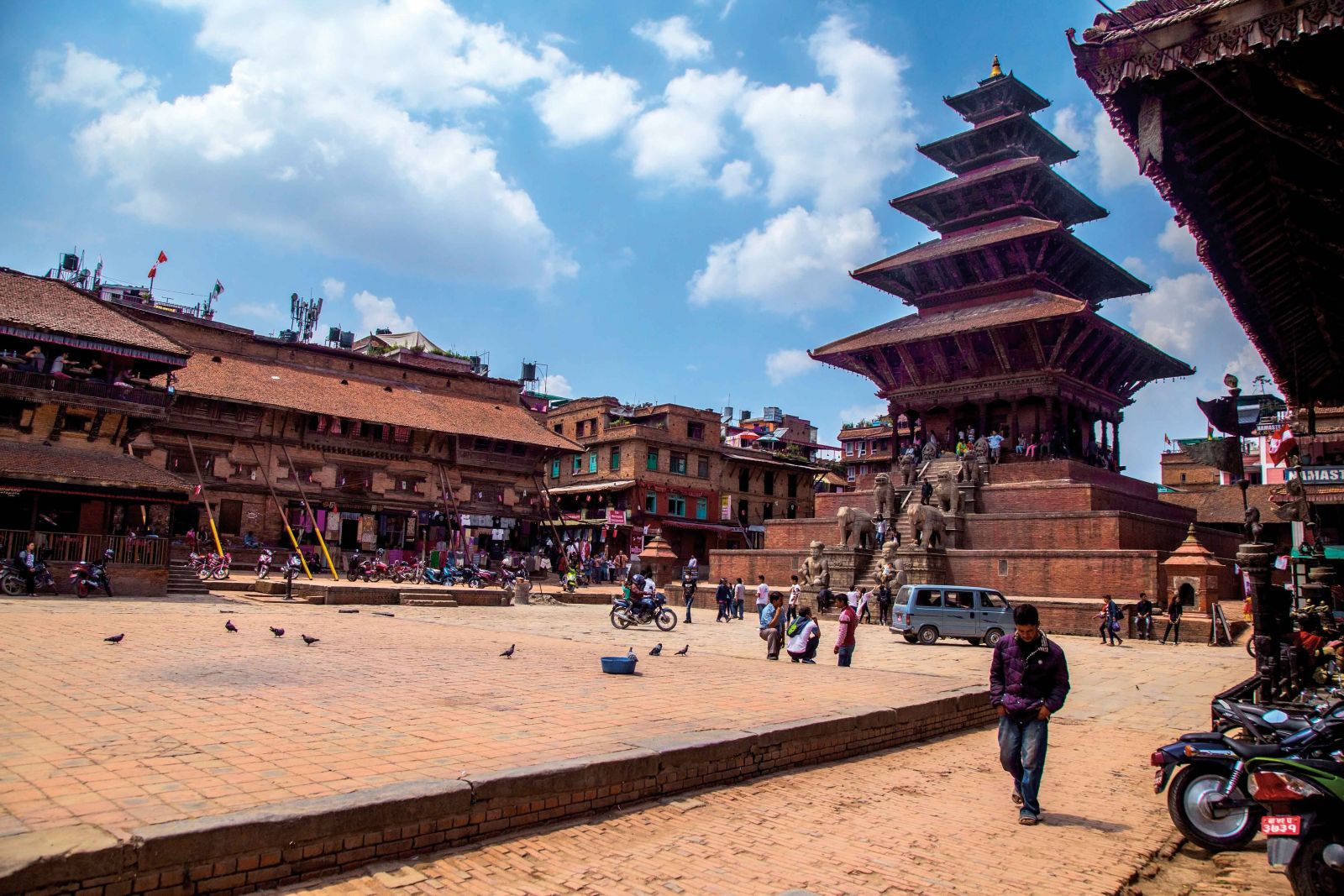 The majestic Nyatapola Temple, dedicated to Goddess Lakshmi, lies in Taumadhi Square. Built in 1702, this five-storied monument is Nepal's tallest pagoda temple, and a hallmark of ancient engineering skill. The stone-carved stairs of the temple have two-meter-high stone statues of legendary wrestlers, tantric goddesses, a pair of elephants, a pair of lions, and a pair of griffons. Also, next to Nyatapola is the very popular and wonderfully crafted Bhairavnath Temple. Similarly, the famous Pottery Square and the Temple of Jeth Ganesh, dating back to the 14th century, are located in this very square. (Worth noting: This is the square where David Beckham played football with children of Bhaktapur on his visit to Nepal in November 2015.)