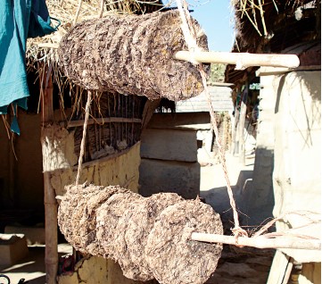 During the winter, women collect green vegetables, especially mustard leaves, broad leaf mustard, and grass peas, let them wither a bit, and wrap them in black gram paste. Drying them in the sun makes biriya, as they call it locally. It is stored to be cooked during the rainy season, when green vegetables are scarce. The black gram paste gives a tangy taste to biriya, and also works as a preservative. Plus, it's a source of high protein.