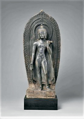This masterpiece features a calm, serene expression combined with the gentle, delicate modeling characteristic of Buddha images. The Buddha’s left hand is holding the end of his diaphanous robe while the right hand is extended in the gesture of munificence. Bangdel determined that the overall style is reminiscent of the Mathura school of north India, the oval halo with pearl and flame motif is in Nepal’s Licchavi tradition of (5th-8th century CE), and the flame border around the entire image reflects post-Licchavi period influence. He estimated that this statue was carved in the 11th-12th century CE during the late Thakuri period of rule.
