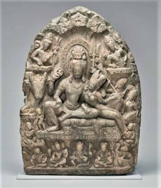 What Bangdel saw took his breath away. It was an exquisite sculpture known as an Uma-Maheshvara panel, in grey limestone, 29½ inches tall, of the goddess Parvati with Lord Shiva and their various attendants. Lain instantly recognized it as a one he had photographed a few months earlier in Patan. On its stylistic merit, he had dated it to the 10th century CE (current era). He did not know it was missing. But now, here it was in front of him.