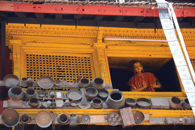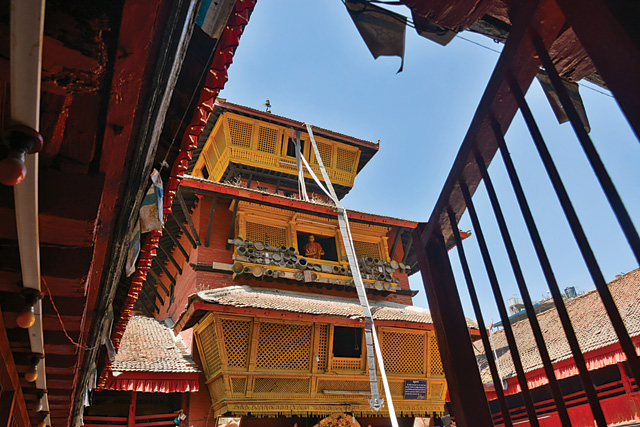 Till today, the full?height metal image on the ground floor of the three?storey temple of Tham Bahi is worshipped every day as Singha Sartha Bahu or Garuda Aju, who is regarded by the Pradhan community of this area as their ancestor. A similar image, stored elsewhere in the monastery complex, is put on display on a small shelter in the adjoining Tun Chukha courtyard on the full moon day of Fagun (February/March), and is paraded around town the next evening accompanied by traditional musical and much religious fanfare. The reason for this honor bestowed upon the deity, popularly known as Chakan Dyo, is based on a vibrant legend.