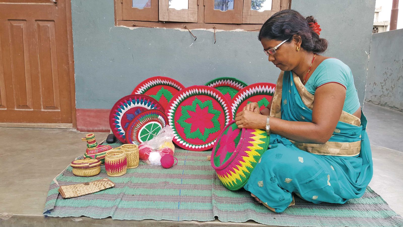 The coloured sikki splinters are soaked in water and as in the case of kans grass baskets, with the help of a takuwa the colourful sikki splinters are wound around kans grass. They create beautiful colourful patterns on the basket by further weaving sikki splinters on the basket – that requires some real skills!