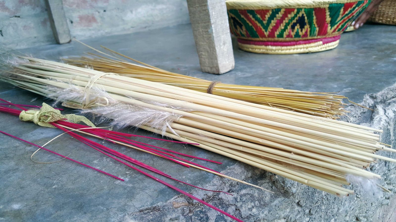 The beautiful baskets called pauti and daliya in the local language of the Terai are woven similarly. First, sikki stems are collected and torn apart into two equal splinters. Then they are left to dry. Once dried, they are coloured.