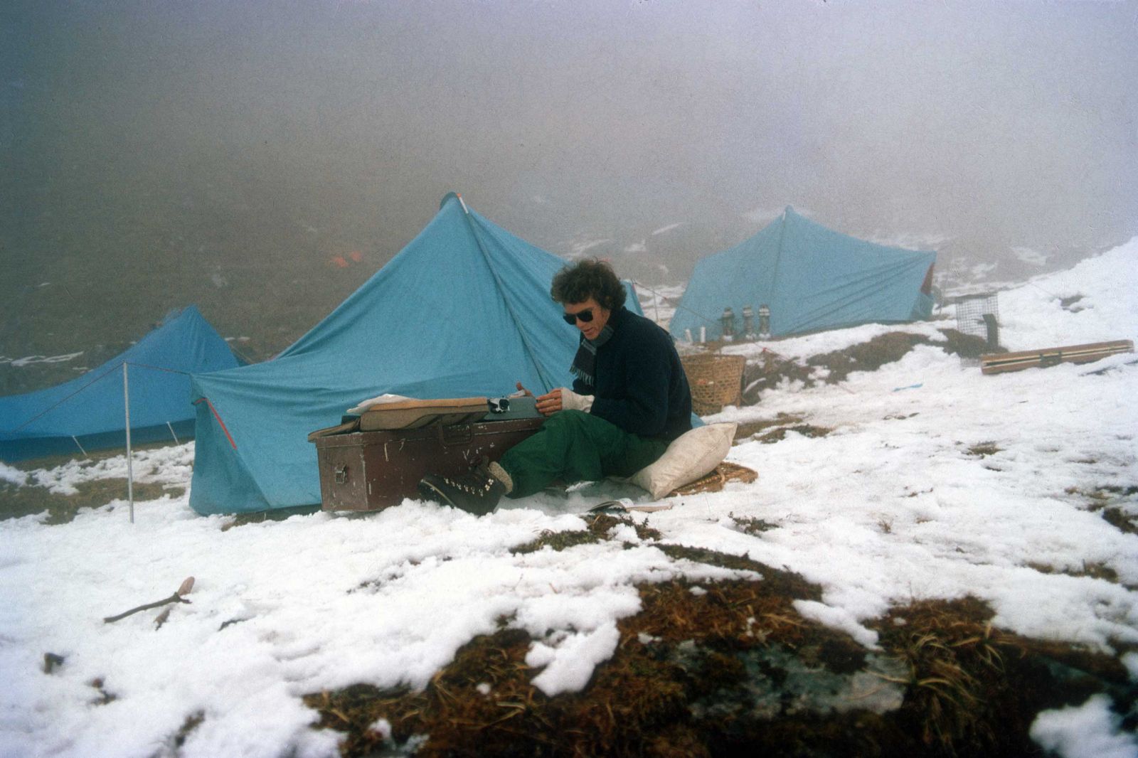 Figure 11. Ted Cronin at a higher elevation camp, typing up field notes (photograph by J. McNeely).