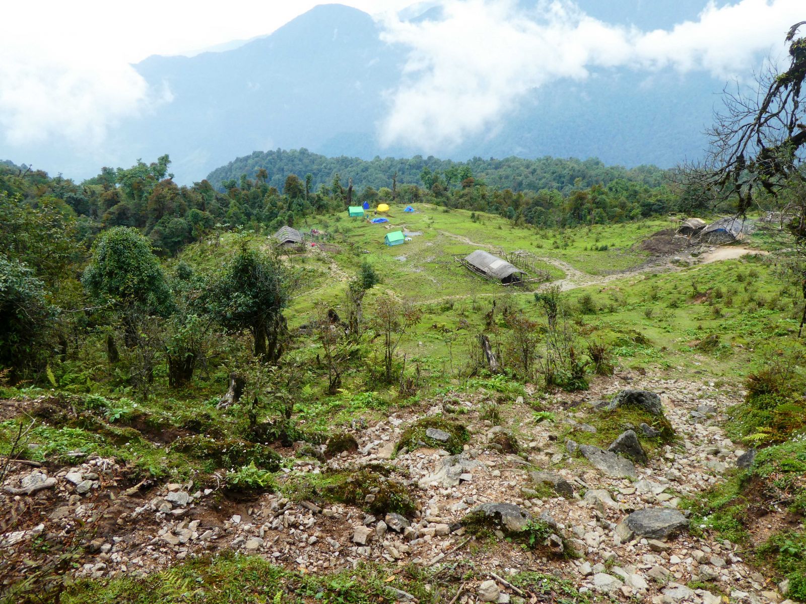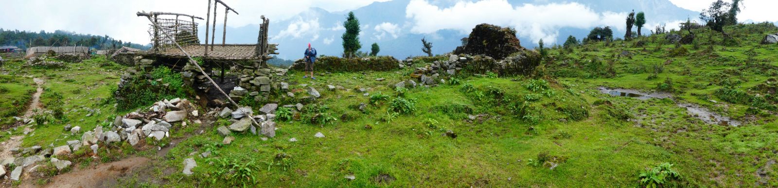 Three bamboo thatch-roofed goths (herder shelters) were part of the cleared landscape, next to what were clearly were the ruins of AVWE’s lab/sleeping quarters/dining hall buildings off to the west. Several cattle grazed in the distance, chickens pecked and clucked around one of the goths, and cow pies littered the pasture which, at this relatively low altitude, already had me thinking of higher and more desirable camping sites for our long overdue rest day. Whether or not the surrounding upper-temperate forest of oaks, magnolias, and rhododendron could still be classified as “healthy” was perhaps open to debate, as there was abundant evidence of significant human and livestock disturbance (trampled earth, cut trees, eroded hillslopes). But we went to sleep that night to the periodic calls of the Tawny Wood Owl (Strix aluco), perhaps a descendant of the “…earless, brown-eyed form sitting hunched in the black retreat of the forest canopy” that Cronin says he used to listen to in the evening.