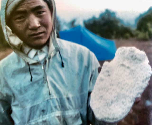 “…they were confiscated by Customs at the Kathmandu airport when Andrew Laurie [a Cambridge University wildlife biologist who was studying the Asian Rhinoceros in Chitwan at the time] tried to take them to Bangkok for me. He was asked what they were, and he innocently responded “yeti footprints,” so the Customs officials confiscated them because they were ‘national treasures’ and never seen again.”