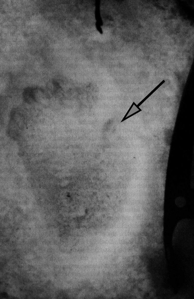 Figure 17 (left). Jeff McNeely’s research assistant, Ang Babu Sherpa, holding one of the plaster casts that McNeely made of the tracks found in Cronin and Emery’s camp near the Shipton La (photograph by J. McNeely). Figure 18 (right). Photograph of one of the tracks in the snow. Arrow points to the opposing thumb feature that wildlife biologist George Schaller, when inspecting the cast, said reminded him of a mountain gorilla track (photograph by T. Cronin; some brightness/contrast adjustment performed by the author for enhanced print visibility).