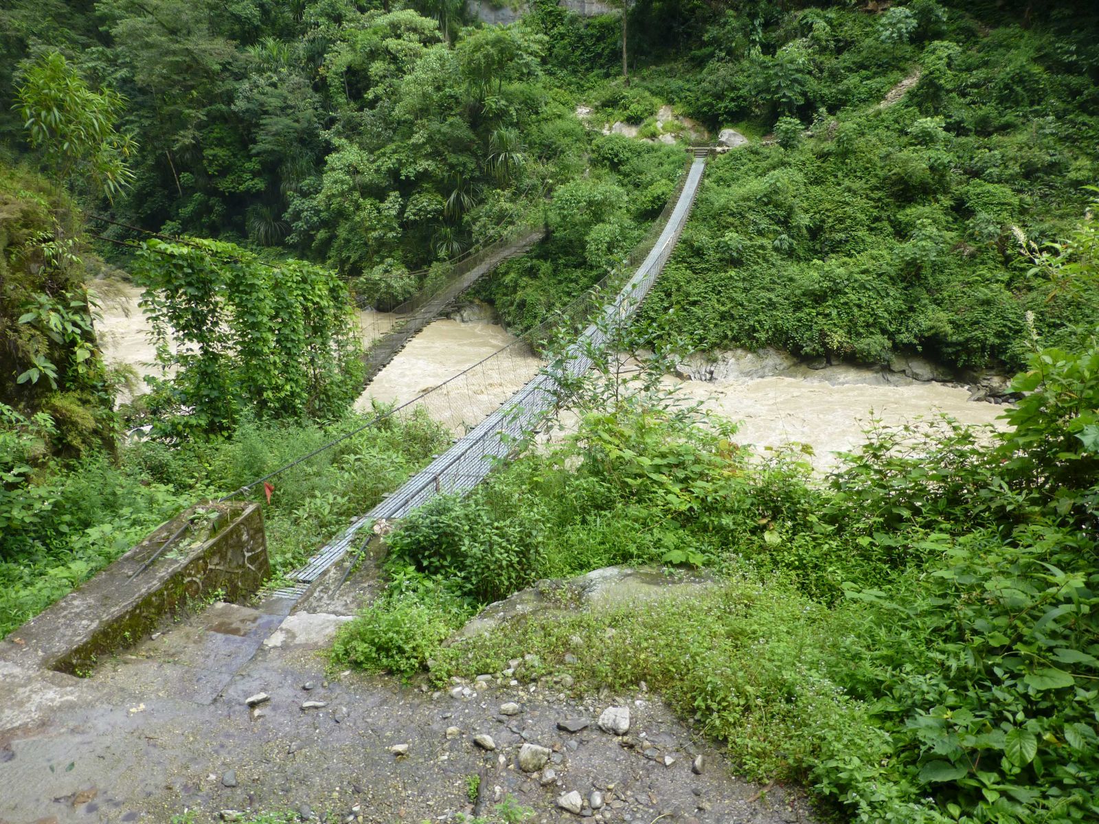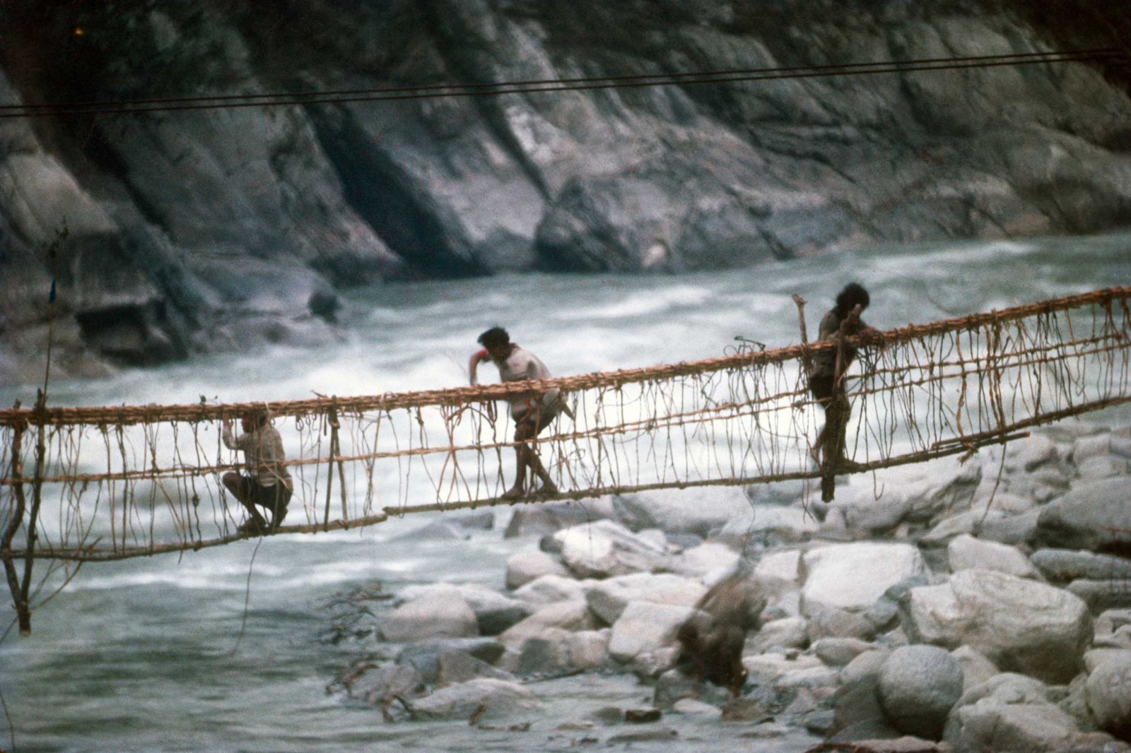 Figure 3 (left). The bridge made of woven vines over the Arun below Num, being repaired and upgraded by porters prior to its crossing by more than 285 porters, each carrying an 80-pound (36 kg) load (photograph by J. McNeely). Figure 4 (right). The metal cable bridge today. The old wooden bridge which replaced the bamboo and rope bridge of the 1970s can be seen to the left, or downstream, of the new metal cable bridge (photograph by A. Byers).