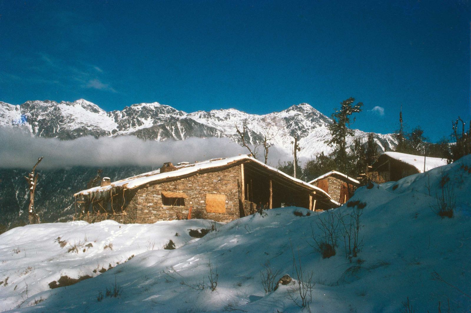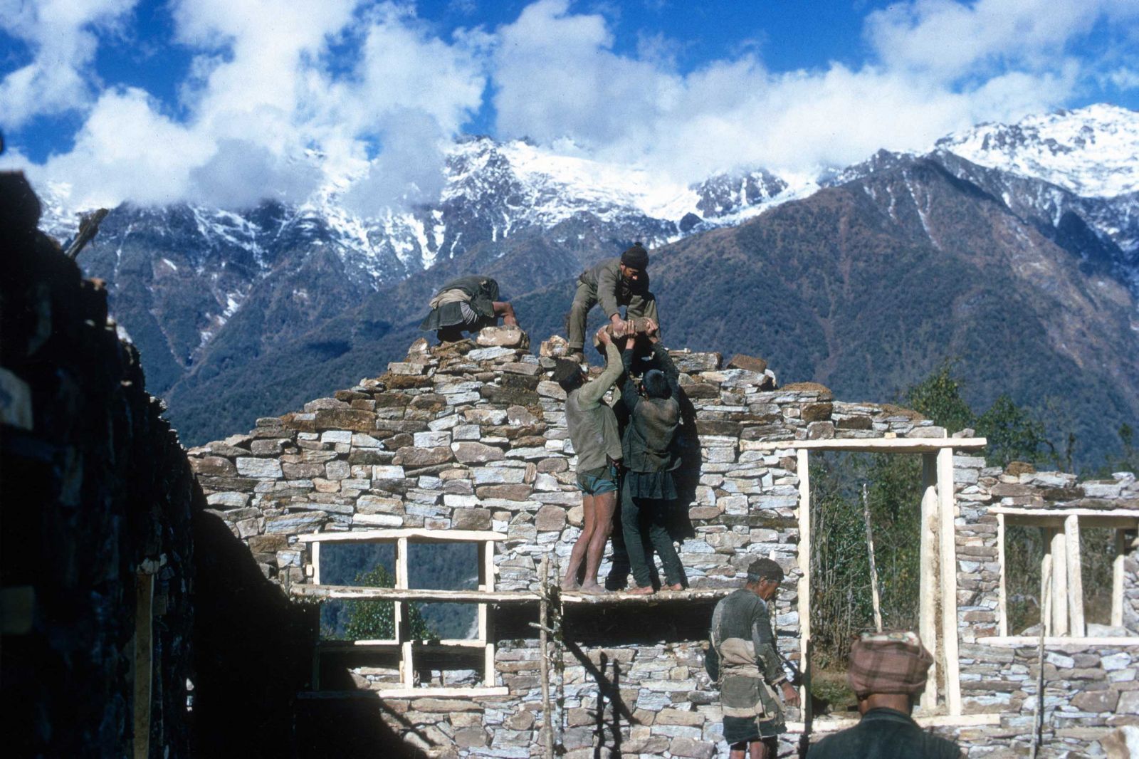Figure 5 (left). Laborers construct the main living quarters for Cronin and McNeely’s staff (photograph by J. McNeely). Figure 6 (right). The final buildings. The Baule Peak range is in the background, and behind that the trekking route to the Makalu Basecamp (photograph by J. McNeely).