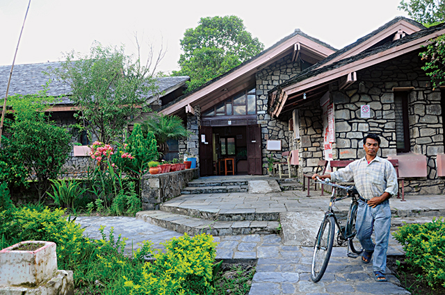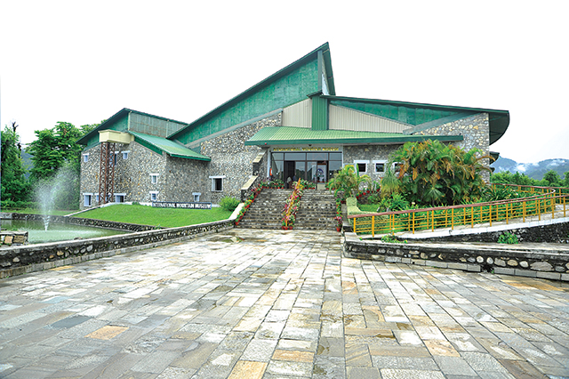 Walking towards the main museum of the International Mountain Museum (IMM), you might get to see unripe coffee berries (if it’s the season of unripe coffee berries) hanging from the coffee bush to the right. On the left, a huge ground with a few small houses and a mock Mt Manaslu invites visitors to climb it. Further down the path, you will come across a Chorten in memory of those who have perished in the mountains, standing in full view of the museum. You instantly know that this museum is about the mountains and the lives of the people who live with it and around it.