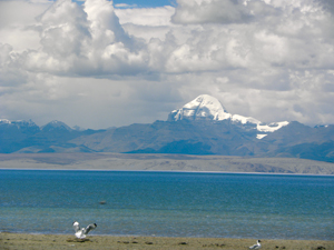 Across Manasarovar Lake's south shore rises the distant scarred face of Mt. Kailash