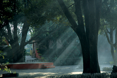 Kapoor trees line the pathway, catching the morning sunlight and bathing the area in a warm haze.