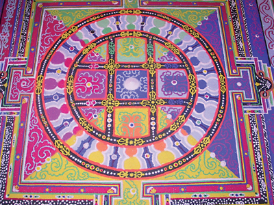 Normally the construction of this mandala would take five to seven days, but with permission from the Khempo of Mustang, up to eight students worked for some 25 hours over a three-day period to complete it for the exhibition.