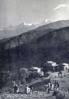 Today, rough seasonal roads crisscross the hills, but back then there were no motor roads and few settlements. Throughout their two-day march up the ridge Baudha “hovered intermittently above the northern mists” – a scene, he says, which “encouraged the sahibs, somewhat daunted the coolies, and cheered the Sherpas.” It was also a challenge, for the expedition was rapidly running out of food. And though they met a few woodsmen and villagers on the way up, they were not able to buy any food. Their last hope settled on the one last little village, high up on the ridge –