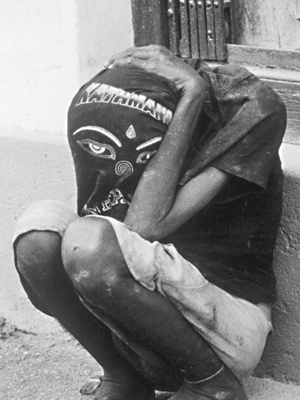 When I spoke about the exhibit, I noted that even though it is 2003 (or the Nepali year 2059) all over the world, there seemed to be some equation of modernity with phenomena that originate outside of Nepal, in more industrialized countries, as though those places exist at a later point in time. This compliments the sense that many foreigners have when we visit remote villages in Nepal: that we are going back in time. Clearly some elements of those villages have remained more constant over the years than parallel elements in the city: people still marry at young ages, still use the stream for their drinking water, still weave mats from local grasses to sit on, etc. There are mixed reactions to this constancy: on the one hand a delight in and nostalgia for the natural rhythms of life that are found in the village, and on the other a sense that the people have been deprived of basic advances in science and technology (often though not always correctly equated with longevity and quality of life) and opportunities to explore the larger world. (When we refer to a village or society as backwards are we also referring to an earlier place in time? Is there an assumption in the negative connotations of the term that everything improves with time?) In Kathmandu, the sense of stepping into an earlier era is not as prevalent, yet in certain places and moments- such as Pashupatinath or Durbar square at Teej or Indra Jatra- one can feel a wind from ancient times still