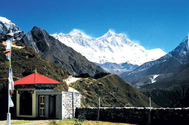It’s about 8:30 in the morning when we decide to head out for an acclimatisation walk to Syangboche and the Everest Hotel. We circle our hotel and reach a trail that passes a chorten and climb to the top of the ridge overlooking Namche. We walk, rotating prayer wheels, as the snow-covered peak of Kwong De looks down. It’s about nine when we reach the top of the ridge and walk on to the airstrip, which is really a large meadow with Mt. Thamserku on one side and Mt. Khumbhila on the other. We follow a fairly level trail past some meadows to the Japanese-built Everest View Hotel and stop for stunning views of Everest and some very expensive lemon tea. On the way back, we pass through the sprawling town of Khumjung. The Khumjung Gompa is home to a famous yeti scalp (later revealed to be a fake) and yeti enthusiasts are allowed to see and even touch this relic for a small fee.