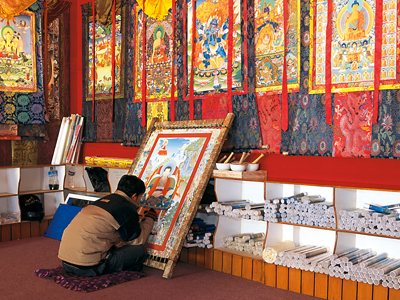 “There are buyers in two categories,” observes Tsonamgel, “those who want thangkas for Buddhist practice, and those who want decorative pieces.” He says those interested in thangkas as art usually choose the Mandalas, the Wheel of Life, and the Life of Buddha. (Less than five minutes after this remark, a cheerful young Danish couple comes in to pick out a bright Mandala for the man’s parents. “We wanted to ask if it’s the right color for them, but we don’t want to spoil the surprise,” he muses.) Buddhist practitioners usually select one of the Buddhas or Bodhisattvas; the Buddha Shakyamuni, White Tara, Green Tara, Manjushri, Vajropani, and Chenrezig are among the most frequently asked for. Tsonamgel notes that these are common to all schools of Tibetan Buddhism, but that each of the four schools (Nyingma, Sakya, Kagyu, and Gelugpa) also has their own special root gurus (Lama), family gods (Yidam) and Dakini (female deities or Khandro). Tsonamgel keeps track of what is selling, and reports back to the painters of the cooperative so they can adjust their output accordingly. “If today I paint the White Tara, maybe tomorrow I make the Mandala,” says Nyima. Tsonamgel adds, “Sometimes to compete in the market we have to buy from painters outside the cooperative; we’re not always able to meet the demand within the group.”