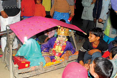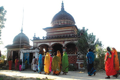 On the day, dahi (curd) and chiura (beaten rice) are the prasad, or devotional gift to eat. Both are devoured in vast amounts, laced with sugar. Meeti, the tantalizing milk sweet of India is offered at every corner, and next to those are stalls selling every form of religious picture and trinket. The essence of ripe oranges fills the air throughout.