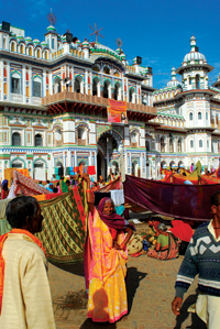 The city of Janakpur shows the diversity that is a characteristic of the entire country. The streets, art and buildings are beyond comparison in all this land. Unique is the word. Walking through its streets instantly transports one to a place not so different from India’s Rajasthan. The 52 constructed ponds and ghats are a wonder to behold architecturally, and amazing places to pay devotion to the sacred couple, especially when the colors of the rising sun shine bright. Nowadays there are probably more temples in Janakpur to the Ramayana characters, than there are inhabitants.