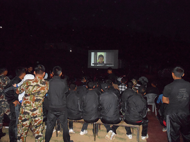 “The traveling package was special at Chautara this year,” shares Basanta Thapa, the chairperson of KIMFF. “We had special screenings of ‘Who will be a Gurkha?’ for the army barracks and after office shows for the civil servants.” Every year, KIMFF travels to various parts of Nepal showcasing the selected films (most of which are documentaries) in order to make the public beyond Kathmandu aware about the issues of the country. Films are one of the best ways to educate people for they are sources of entertainment as well as information. Basically, when KIMFF travels to a place, they partner with a local club or organization that takes care of the logistics and publicity. Films are screened for two days with three shows per day, unless there is a demand for more. For a place without a single cinema hall like Chautara, the source of films is limited to channels on TV that telecast Nepali and Indian cinema. Thus, as documentaries are a new format for them, information about the genre and the movie is given before the screening while interactions follow later.