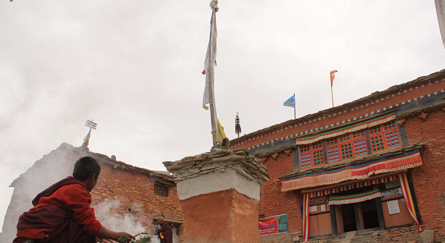 For the last week people streamed out of the barren mountains in increasing numbers, converging onto the main trail like migrating salmon being called back by some unknown force. Some came from as far away as Mustang, others from distant villages and regions that I have never heard of. As I neared the maroon monastery, the pungent smell of burning juniper engulfed me. Rounding a massive chorten, I stopped amidst the steady flow of circumambulators and fixated on the multi-colored prayer flags trembling against the turquoise sky. The faint whuff of helicopter blades thudded through the valley, steadily growing louder. Suddenly the aircraft shot out from between the mountains and banked in a tight circle, easing down near the swollen stream below. Throngs of people rushed across the rickety wooden bridge to greet the head Lama, Rabjam Rinpoche, the guest of honor. Horns bellowed, incense piles were fanned and drums sounded to signal his arrival. Flanked on either side by monks donning crescent yellow hats and trumpets with parasol in tow, the beaming rotund figure and his procession slowly advanced up the slope in a dazzling spectacle of color and sound to help kick off the twelve-year SheyGompa festival.