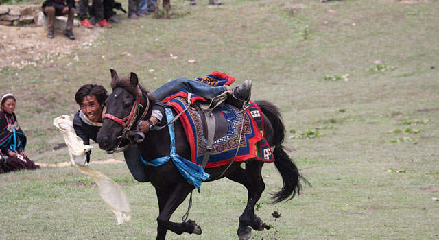Horse stunts captivated the audience. No one could touch the horseman from Mustang, who easily surpassed everyone with his flair and showmanship. He precariously bent over his mount as he galloped, his head inches from the ground, snatching up kataas and one-rupee notes to the cheer and jaunts of onlookers. After the rupees were exhausted, others tried to goad the godaas into tossing a spare dollar or two onto the field, which confirmed how extensive the universal reach of US dollars had become. Would he also accept Visa?