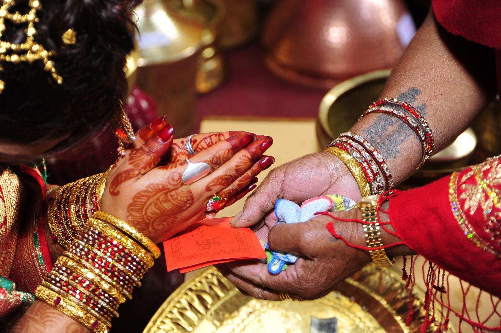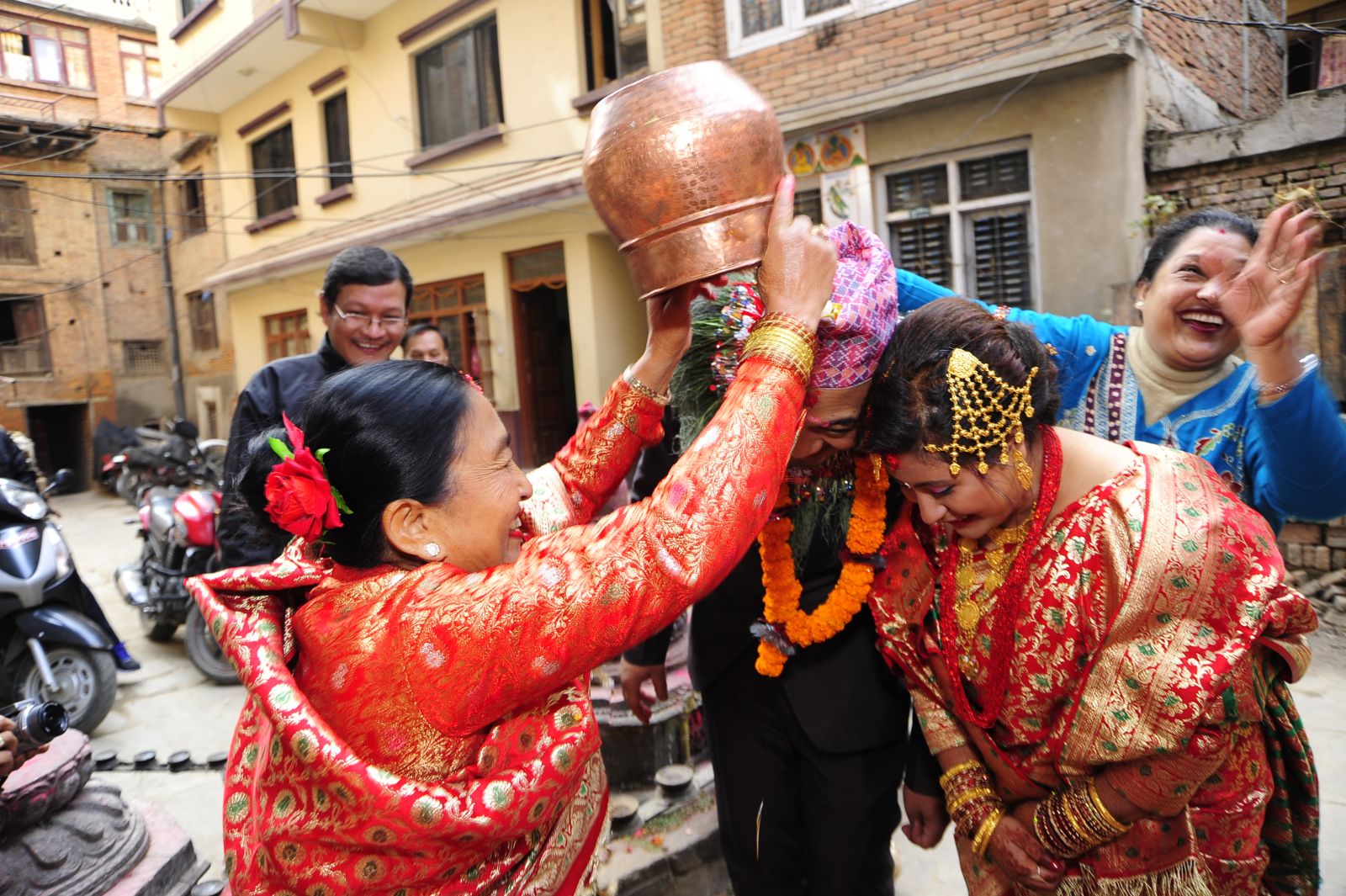 Before the marriage ceremony, representatives from the groom’s family: the groom’s uncle, a Jyapu, and the lami are sent to the bride’s home with a golden bracelet (Kalya), gifts,. and food. This ritual is called Kalya Nhynke Chhoye. After receiving these gifts, the bride’s aunt paints her legs with alah (a mixture of red color and water) to decorate her as a bride. In the evening of the big feast (Payena Biye Bhwe), relatives and friends of the bride are invited, who present her with different household utensils as dowry, which is called Kosa.
