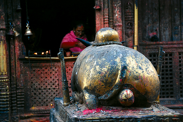 Out of hundreds of Ganesh shrines in the Valley, the one just in front of Banglamukhi temple in Patan is very special. Instead of a rodent, Ganesh’s traditionally ‘official’ mount, you’ll find an ox standing guard. Inside the Banglamukhi temple complex another Ganesh mandir (temple) tells the same story. Whatever happened to Ganesh’s rat? Has the ox taken over? Has it trampled the poor rat under its strong hoofs?