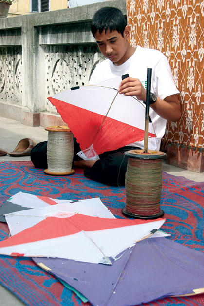 Dayaram Joshi, a shopkeeper in Ason, sitting serenely amongst his colorful display of kites, says that selecting a kite is an art in itself. He says that a keen, incisive flyer can just feel the kite that will obey him in the sky. Though the square shaped Malay kite with an indistinct tail (a short snout triangle) is the only kind available here in Nepal, it still can be categorized into different types on the basis of the materials it is made of, starting from those made out of recycled paper to the ones made of plastic. The simplicity of the Malay kite adds up to its swiftness, which makes flying it more enjoyable. Most of the kites and spools come from India, but the best kites are those made out of lokta, the traditional Nepali handmade paper. The lightness of lokta makes it a preferable material for flyers, but they are quite flimsy and easily torn. Hence, children and novices not acquainted with the art of kite-flying are recommended to first learn with kites made of plastics, as they are much stronger and are equipped with a long tail which tames the kite down to some extent.