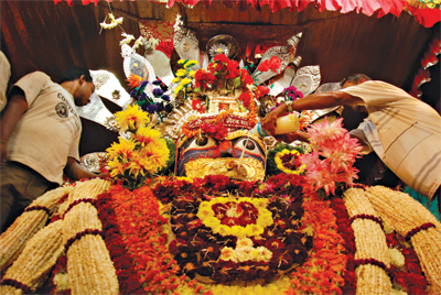 Lord Aakash Bhairav - the god of the sky, is also regarded as the ancestor of the Maharjan caste, especially the peasant groups. An image of the Buddha (the Hindus call it Brahma, the creator) is seen on the forehead of Aakash Bhairav and so Aakash Bhairav is equally revered by Buddhists as well.