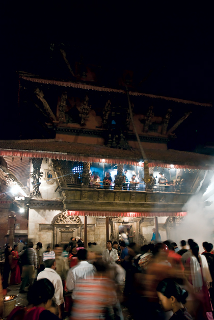 The procession is taken through the narrowly ancient streets of Patan, in route that roughly encircles the temple. Throughout the route, people have spilled across the streets where there is much merry-making, which is evident by the gales of laughter mixing with the noise blaring from all direction. The atmosphere is enlivened by the strong aroma of home-made incense. Most of the devotees are burning incense right and left and the aroma hunts the streets numbing every sense, demanding torrents of tear as sacrifice. There is ancient magic afloat in the air, the kind that makes people wish that the merry making time would last forever. All eyes are scanning the horizon, or at least the last galli or the chowk visible, before the buildings closed in on the either side.