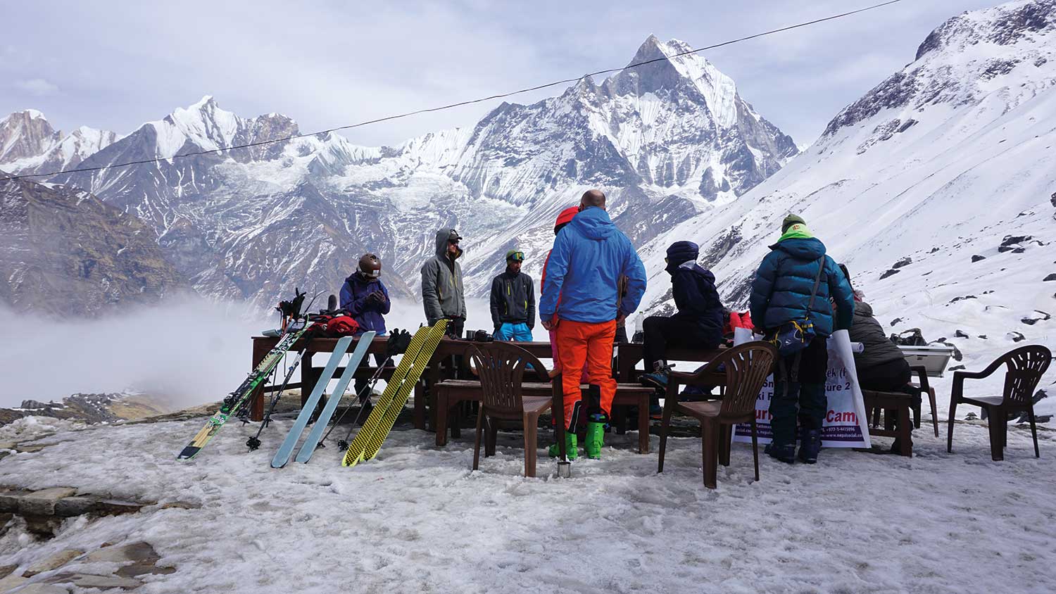 one-night two-day package to get you started: this year, they’ve already taken over 1000 people skiing, incredible for such a new operation. You don’t have to have any prior experience, they’ll teach people at all levels. In the Annapurna Base Camp area, the skiing season is much longer, but so is the distance and length of the trip, usually about ten days in total, and so it’s more of a second-level trip for people who already have experience or have learned the basics in Kalinchowk. “We focus very much on safety, if there’s too much snow, we don’t do it,” Suraj Kafle explained. “We coordinate with locals, the weather forecast, and update the team in the mountains at all times.” Their clients are not just, or even mostly, foreign tourists, but they also target the local growing group of Nepalis who want to travel, with affordable and practical packages.
