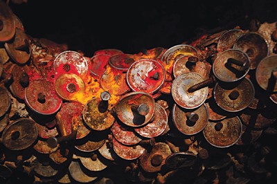 Belief systems are perhaps the first medicines known to man, and whether they cause a difference or not is subjective. Compared with modern day medication, they seem strange and mythic. Rickshaw drivers wait by the Ikha Narayan (10), a small two-roofed temple. Its shrine houses a beautiful 10th-11th century four-armed Sridhara Vishnu, flanked by Lakshmi and Garuda. On the same road, continue through a busy Newar neighborhood to the next intersection, where the Kal Tol temple sits with its stacks of pottery. Toothache sufferers seeking a cure have driven hundreds of nails into a slab of wood here. Opposite, under a roof, a piece of wood is punctured with thousands of nails around a tiny gilded image of Vaisha Dev, the god of toothache. To plant a nail here is to get rid of pain by pinning down all evil spirits and influences. If this folk remedy doesn’t work, the nearby lane is filled with dentists’ parlors left and right. Their window displays of advertisements of dentures provide the medical approach. Some of them face the road, so all who wish can watch a tooth being extracted.