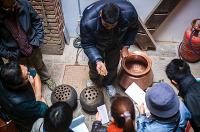Prakash and Jitendra Shrestha have been negotiating the inclusion of outsiders to the Newari community for some time. Both have renovated their houses and turned them into contemporary home-stays for people wishing to experience their culture and the lifestyles of the Newars. More importantly they have remolded their thoughts to be less dogmatic. Likewise, a recent venture for the two has been exposing the clandestine art of making Nepali alcohol through a course on making aaila.