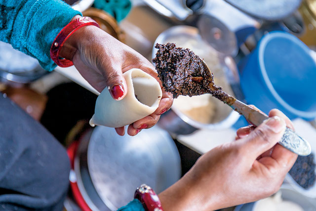 As I walked towards Swotha tole from Mangalbazar, I saw many craft shops and their owners chilling outside, with wide smiles and talks of the elections. Being a Newar, I could understand what they were talking about, and so I couldn’t stop overhearing one shopkeeper describe the khuwa ko yomari that an eatery nearby served. I couldn’t grasp all the details he was sharing, however, I did catch hold of the name of the shop—Nandini Eatery Shop. So, I called up my friends right then and there, and lured them to come have yomaris with the same enthusiasm and with the same confidence as the man who I overhead describing it. I hit the right spot, and my friends agreed to come. While I waited for them to arrive, I sipped a glass of sugary tea at the same place and had a conversation with the lady cook of the eatery. She smiled widely as I asked her some rookie questions about the food. Even though I could recognize some dishes, there were many items that I had never seen or heard of.