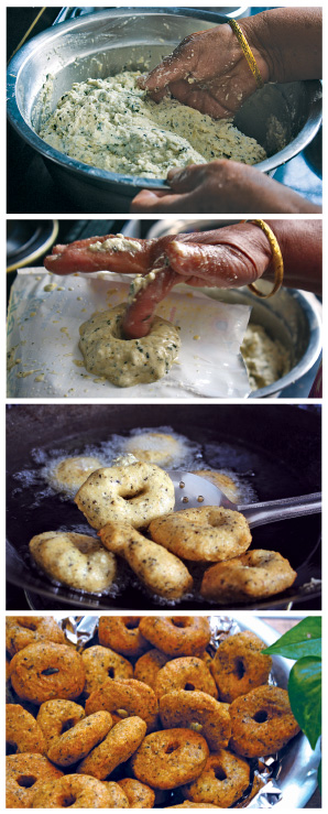 Batuk roti is made from black lentils that have been soaked for over twenty-four hours. After removing the outer black layer, the lentils are washed thoroughly with clean water, and then ground to form a very fine paste. Although the recipe could differ from one family to another, the most common ingredients to add are ginger paste and salt. A small amount of the mixture is then laid flat on a smooth surface (my grandmother prefers to recycle the inside of an oil packet) and formed into a small round shape with the help of the palm. A batuk is not a batuk without a distinct hole, hence, using a finger, one is created in the middle. It is fried on a deep frying pan or wok, half filled with vegetable or sunflower oil. It is best to leave it for two-three minutes, until both sides turn golden brown.