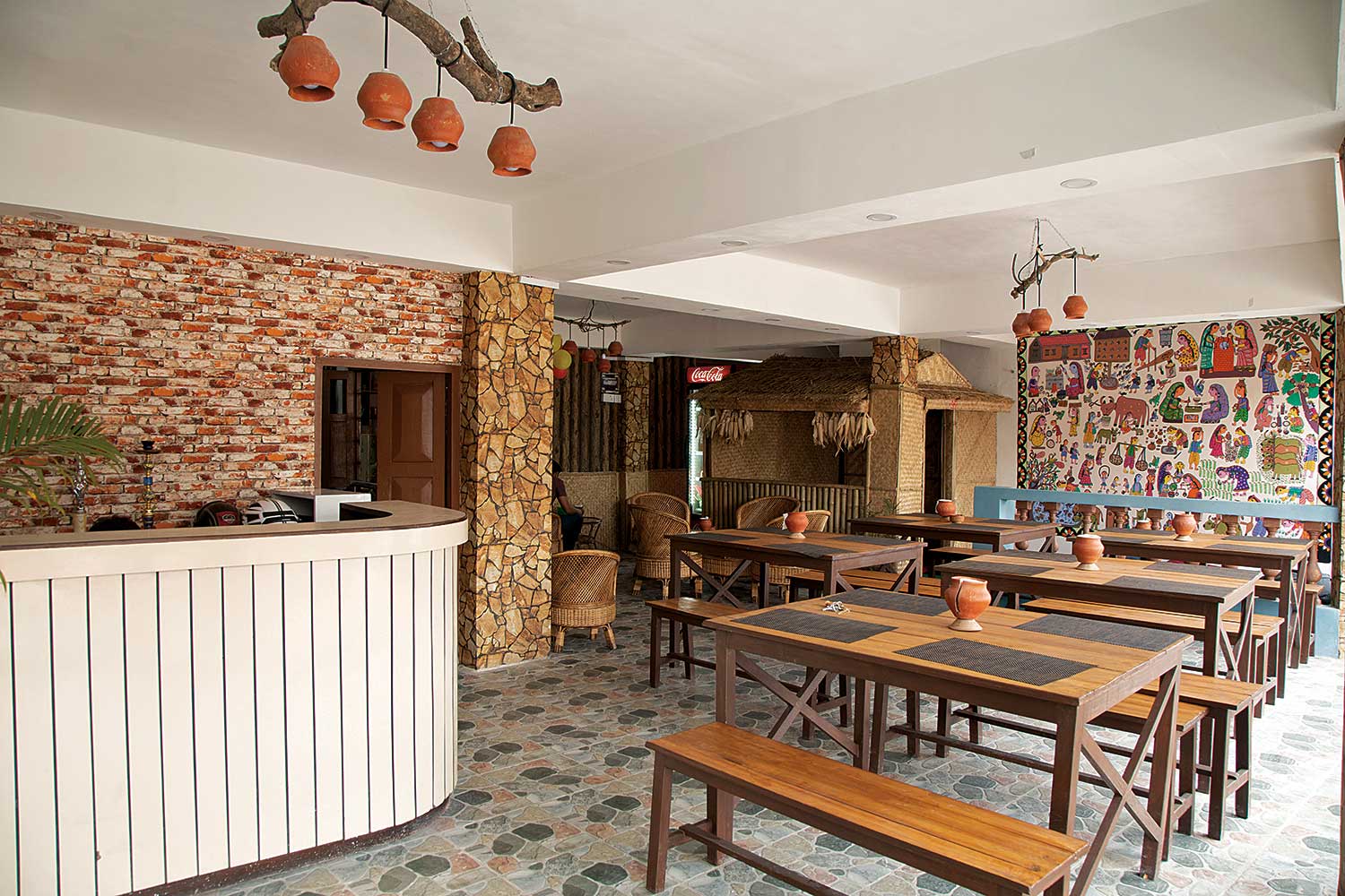 Located in Rudramati Marga by the banks of Dhobi Khola, Matiya House is a pleasant little restaurant. As soon as you walk in the doors, you’ll see a small makeshift hut made of woven straw like the ones still found in find in villages in the Terai. It is realistically decorated with a bunch of corn cobs hanging off the window and earthen pots lying around. Other parts of the décor also take you back to the Terai including an amazing wall mural of Mithila art that depicts how daily life looked there in the olden days. If you look closely, you’ll even see small fountains near the entrance that subtly add to the traditional elements in the décor.