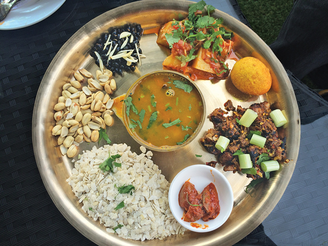 Of course, a ‘bhoye’ is not only about meat and aila; equally delicious seasonal vegetable dishes are also served, along with gainda gudi (different lentils and beans), spinach, and alu tama (potatoes and bamboo shoot curry), and a couple of fiery pickles (achaar). Two of the most popular are alu kerau (a spicy mix of potatoes, radish, green peas, and small brown peas), and tamatar ko achaar (made of ripe tomatoes). The feast also features a salad like dish called chuse muse, which is a mix of raw radish, cucumber, carrot, onion, and tomato slices, and soaked peas.