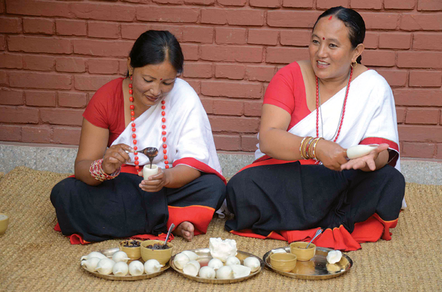 Chandra Maya Maharjan of The Village Café is swift with her hands. I gazed at her in amusement as she drilled her finger into the dough to fill it with khuwa.”The fillings inside the yomari can be different; we usually try five kinds of fillings: Khuwa, chaku, chocolate, black lentil and mushroom” says Chandra Maya. “When I was small, we didn’t even make the chaku paste, we just tucked the chaku piece in and wrapped it inside the fig,” she further adds. The women of The Village Café were busy giving shapes to the yomaris. A perfect yomari always has a tapered end and this is the biggest challenge. “We try to play with the tail than the tip, then it’s much easier to tell which yomari has what filling” says Chandra Maya as she wraps the rice dough in a clover shape to denote it as one filled with khuwa.