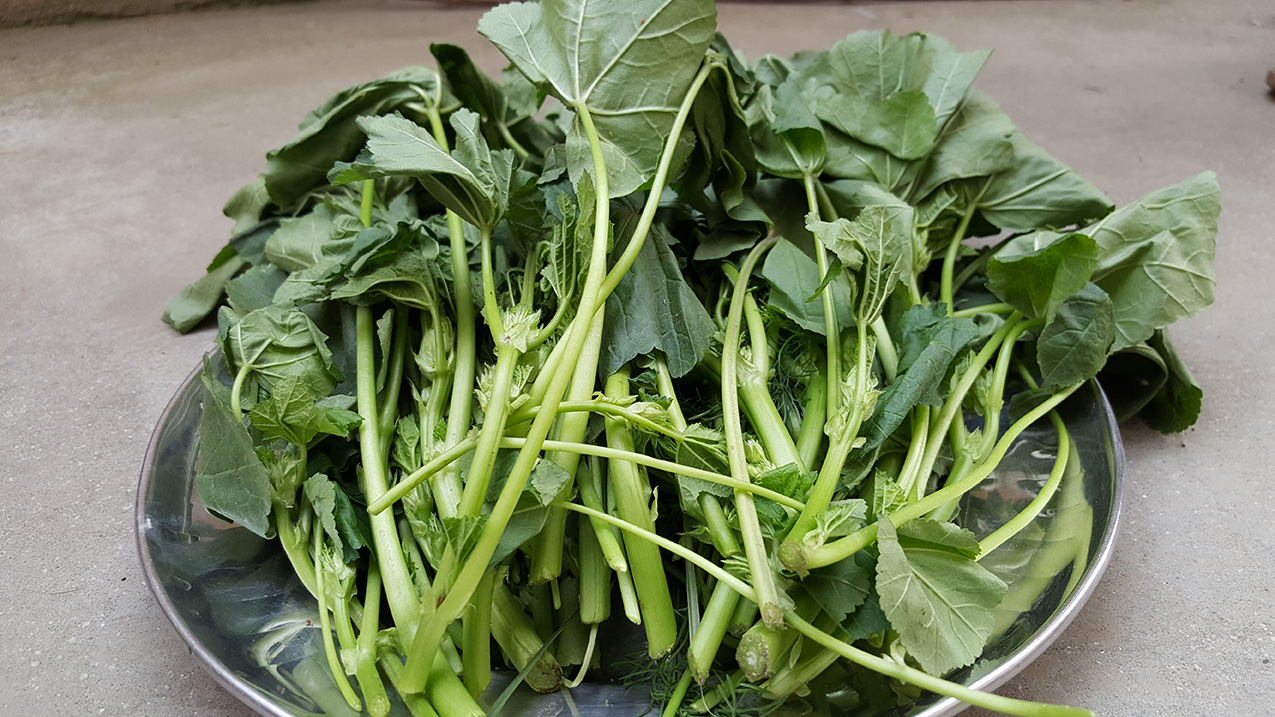 The leaves of naf or lafasaag resemble hollyhock leaves. This green leafy vegetable is found in abundance at the local markets once the winter season approaches. It can be cooked like any other green vegetable but adding a bit of baking soda softens the leaves and adds that tangy taste to it. While its sibling with broader leaves and purplish pink flowers is a decorative plant and a common flower in the gardens, this variety is widely eaten in the southern plains. Slurping its curry along with rice is a delight. Try it when you’re down in southern Nepal.