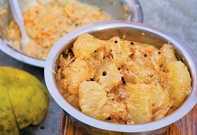 Bhogate Sandeko: The mighty treat of a dish that is bhogate sandeko needs no introduction amongst the Nepali denizens. A winter afternoon, soon after Tihar, calls for the entire family to lounge on the sunny terrace and enjoy this stupendous dish. Bhogate or pomelo, a neither tarty, neither sweet fruit is marinated in yogurt and some regular spices. And while you relish every mouthful of it, you will also find yourself squeezing on its flesh and playing a little game of which-direction-will-your-spouse-come-from.